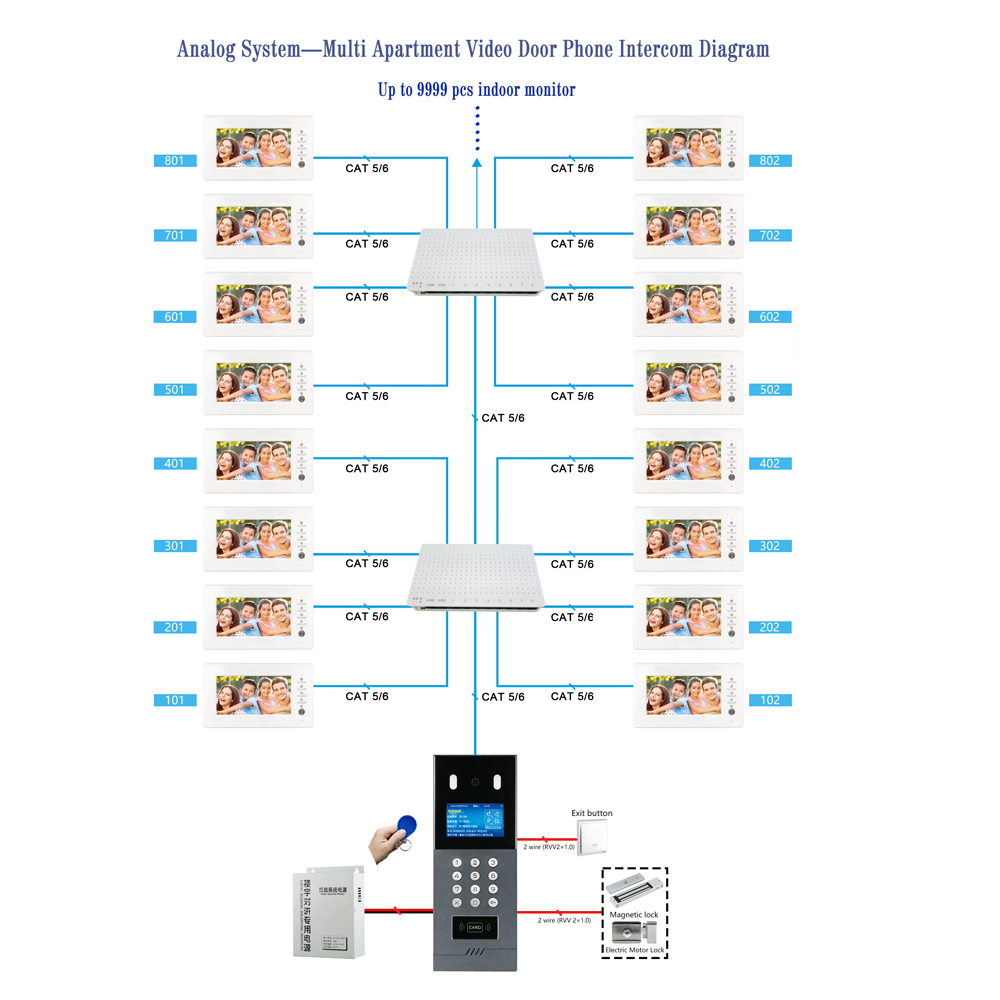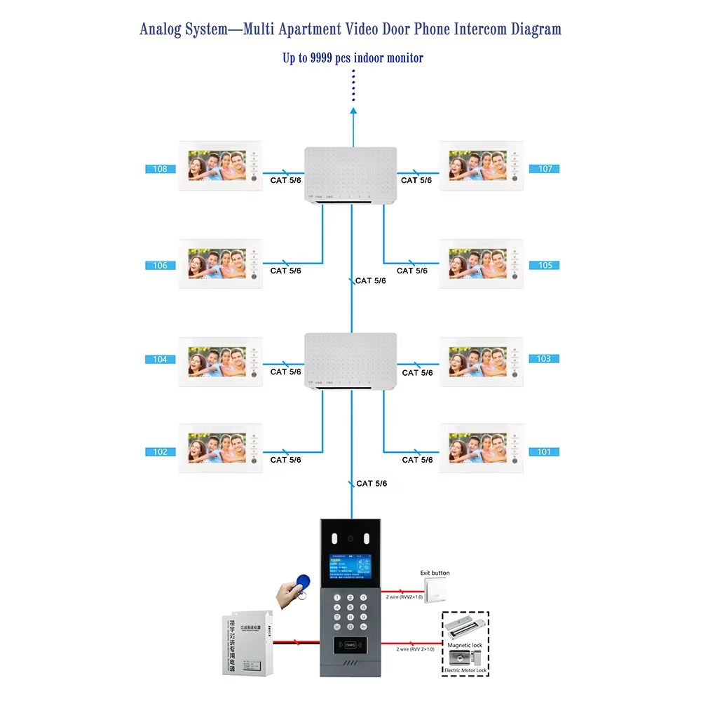 Analog POE Video Door Station, 720P 130° IP65, 4.3″ TFT Glass Mirror, RFID/Password Unlock, 9999 Units, Aluminum Alloy, Flush/Wall Mount