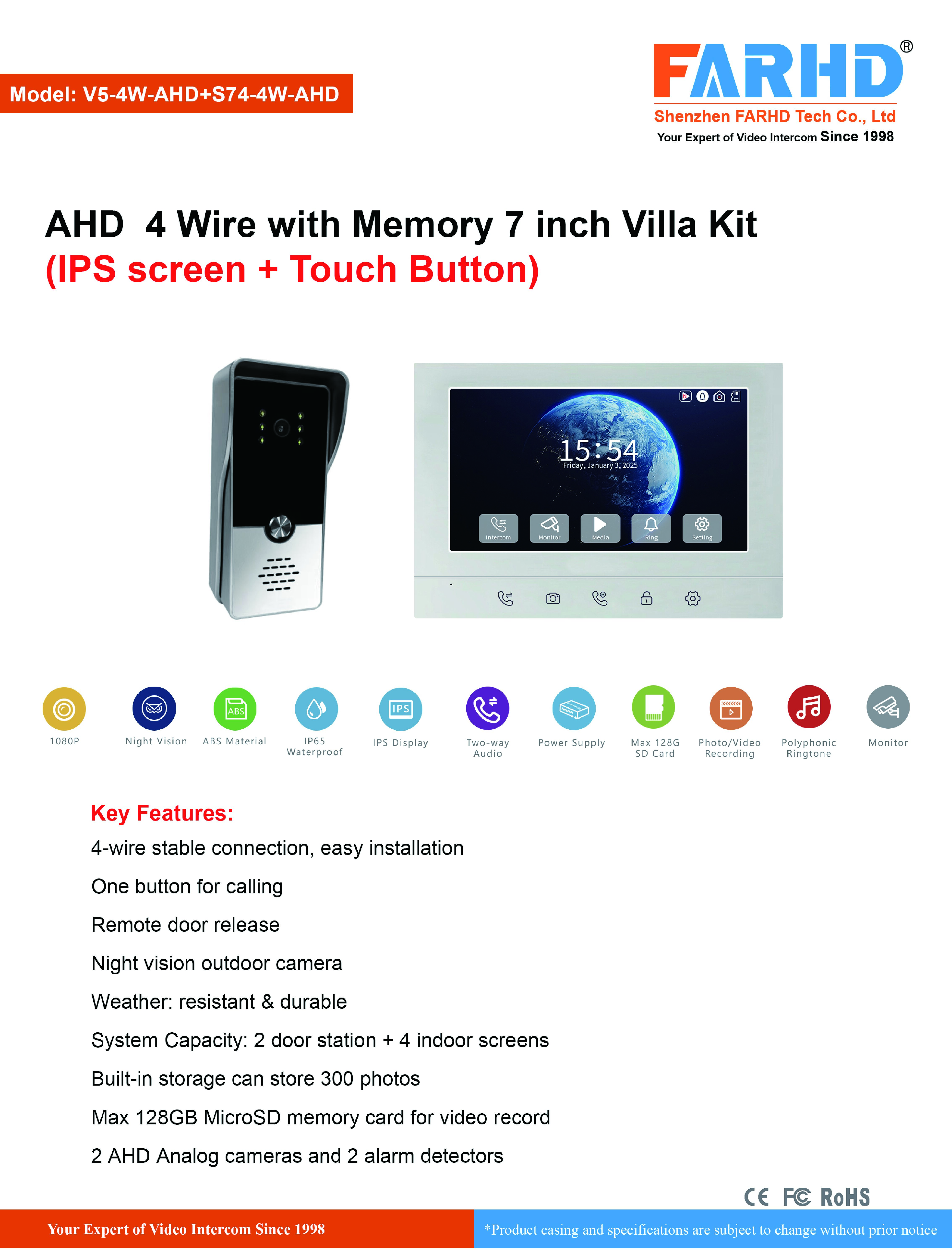 Villa Kit Video Door Intercom Door Phones 4 Wire AHD 7 Inch Indoor Unit Entry System for Video Door Phone